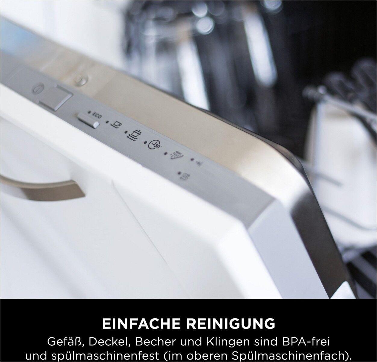 Die Klingen, Becher und Gefäße des Mixers sind spülmaschinenfest im oberen Geschirrkorb – für eine unkomplizierte Reinigung. Für optimale Ergebnisse in der Spülmaschine keine heißen Trockenzyklen verwenden.