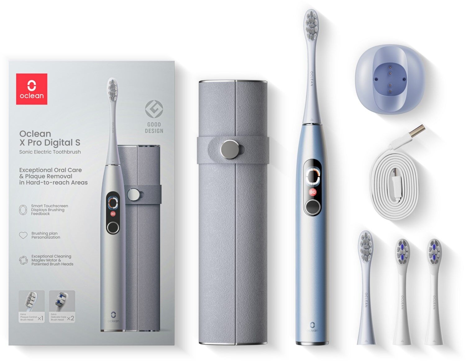 1 x Plaque-Kontrollbürstenkopf, 1 x Weicher Pflegebürstenkopf, 1 x Reiseetui, 1 x 2in1-Ladegerät für Wandmontage, 1 x USB-Micro-Ladekabel, 1 x USB-Typ-C-Ladekabel