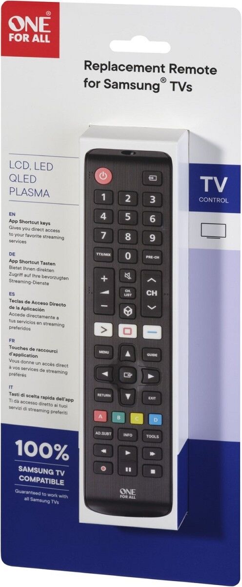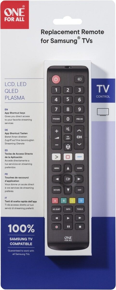 One For All TV Replacement Remotes URC4910. Markenkompatibilität: Samsung, Fernbedienung Nutzung: TV, Schnittstelle: IR Wireless. Anzahl der unterstützten Geräte: 1. Eingangssignal: Drucktasten. Verbesserung des Videotexts