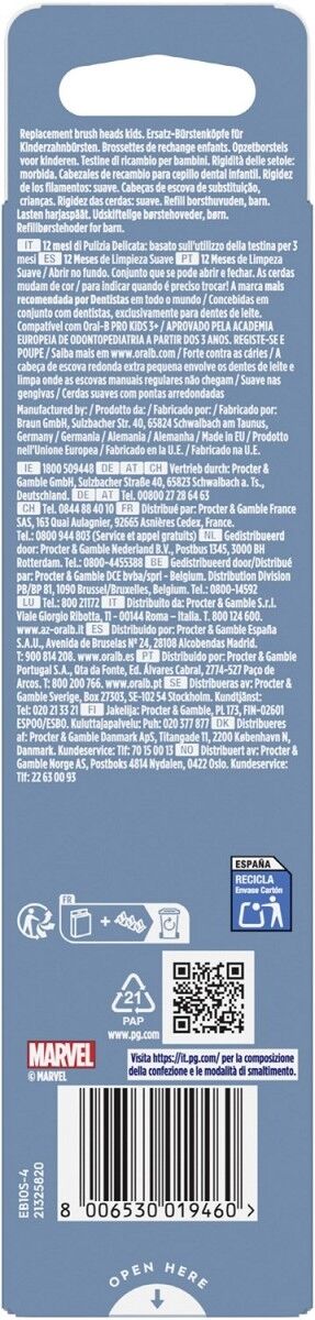 Die Oral-B PRO Kids 3+ Aufsteckbürste bietet Kindern den Spaß von Spiderman und die sanfte, effektive Reinigung einer von ZahnärztInnen empfohlenen Oral-B Zahnbürste. Die extra weichen Borsten und der kleine, runde Bürstenkopf sind speziell für Kinder entwickelt und mit allen elektrischen Zahnbürsten der Oral-B Pro Kids Serie kompatibel.