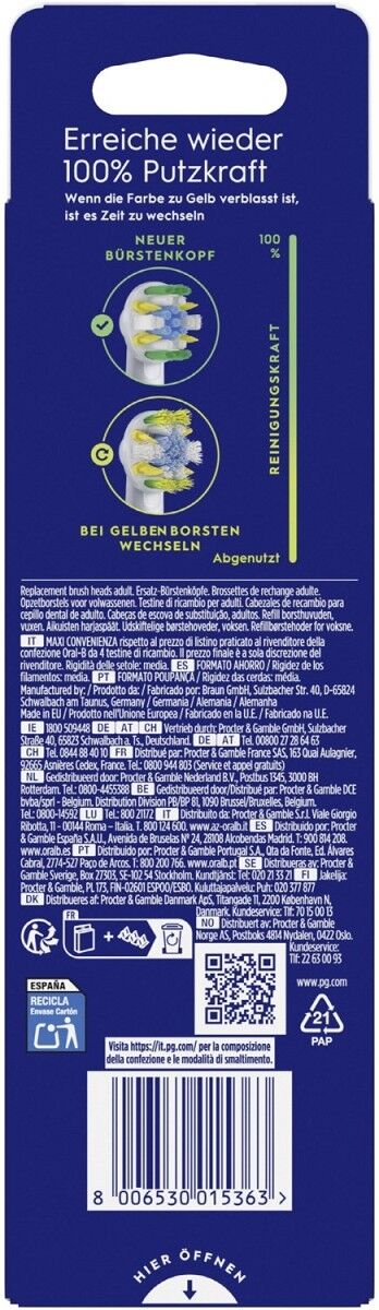 Klinisch bestätigt: Entfernt 10x besser Plaque* als Bürstenköpfe der meistverkauften Eigenmarke in Deutschland** (*12 Wochen durchschnittl. Plaqueentfernung, **Nielsen Handelspanel L12M). Die Original-Bürstenköpfe von Oral-B wurden mit neuen X-förmigen Borsten entwickelt, die nun auch die Stellen reinigen, die normale Borsten nicht erreichen können. Die grünen Indikator-Borsten färben sich mit der Zeit je nach individueller Nutzung gelb und zeigen damit den optimalen Zeitpunkt zum Wechseln der Aufsteckbürste an - für 100% Putzkraft. Garantierte Passform mit allen wiederaufladbaren Zahnbürsten von Oral-B, außer Pulsonic und iO.