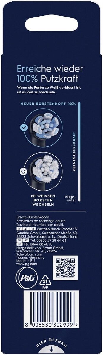 FARBWECHSELNDE BORSTEN: Die Oral-B Aufsteckbürsten verfügen über farbwechselnde Borsten, die signalisieren, wenn der Bürstenkopf gewechselt werden sollte, für maximale Reinigungsleistung