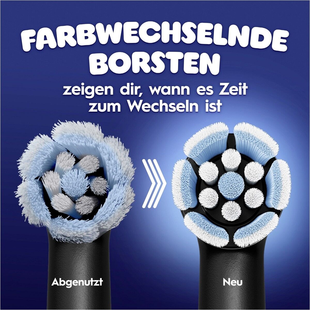 Farbwechselnde Borsten ändern die Farbe von blau zu weiß, wenn die Aufsteckbürste gewechselt werden sollte