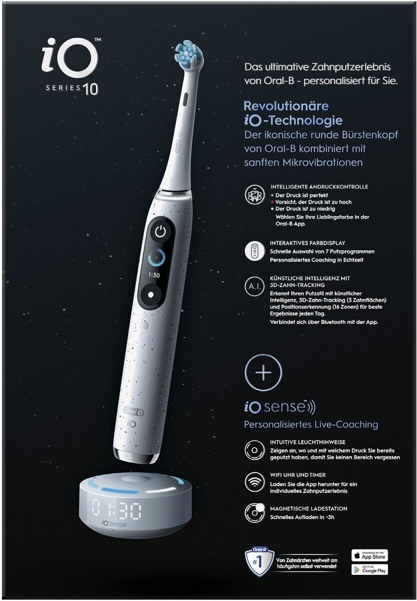 Die iO 10 elektrische Zahnbürste mit der revolutionären iO Sense Ladestation bietet Ihnen personalisiertes Echtzeit- Feedback, um zu wissen wo, wann und wie Sie putzen müssen – für ein effektives und angenehmes Putzerlebnis. Sie kombiniert sanfte Mikrovibrationen mit dem runden Bürstenkopf von Oral-B und sorgt so jeden Tag für das Gefühl einer professionellen Zahnreinigung. Wechseln Sie die Aufsteckbürste Ihrer Oral-B iO Zahnbürste alle 3 Monate, um beste Ergebnisse zu erzielen.