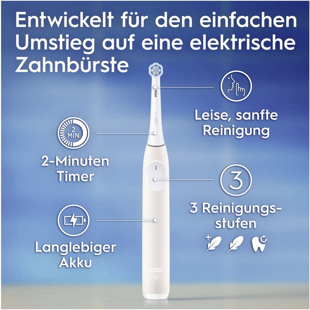 Entwickelt für den einfachen Umstieg auf eine elektrische Zahnbürste mit nur 1 einfachen Knopfdruck, leisen Reinigungsstufen und langlebigem Akku
