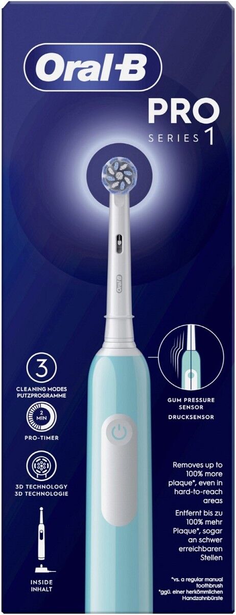 Die elektrische Zahnbürste Oral-B Pro Series 1 hilft Ihnen so zu putzen, wie es Ihr Zahnarzt empfiehlt. Der Timer unterstützt Sie dabei, Ihre Zähne 2 Minuten lang zu putzen und benachrichtigt Sie alle 30 Sekunden, den Putzbereich zu wechseln. Der runde Bürstenkopf entfernt selbst an schwer erreichbaren Stellen bis zu 100% mehr Plaque als eine herkömmliche Handzahnbürste und sorgt für gesünderes Zahnfleisch. Der integrierte Drucksensor reduziert automatisch die Putzgeschwindigkeit, wenn Sie zu viel Druck ausüben.
