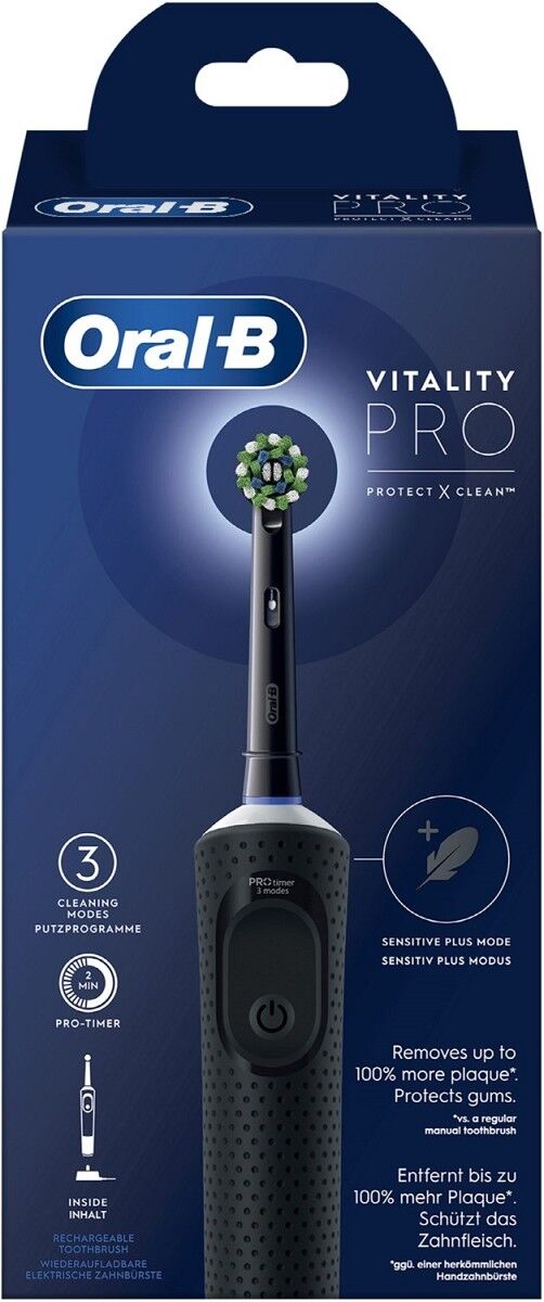 Die Oral-B Vitality Pro wiederaufladbare elektrische Zahnbürste bietet eine klinisch bestätigte überlegene Reinigung im Vergleich zu herkömmlichen Handzahnbürsten. Die Vitality Pro verfügt über 3 Putzprogramme: Tägliche Reinigung, Sensitiv und Sensitiv-Plus für ein erstaunlich sanftes Zahnputzerlebnis.