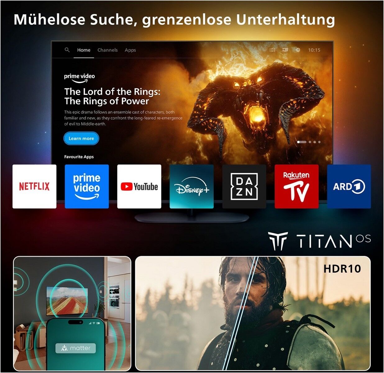Die Philips Smart TV Titan OS-Plattform führt Sie ganz schnell zu den Inhalten, die Sie sich gerne ansehen. Von einzelnen Folgen über Serien bis hin zu Dokumentationen und Dramen – alles, was das Herz begehrt, ist auf Knopfdruck verfügbar. Egal, was Sie sich ansehen möchten, greifen Sie schnell und einfach auf all Ihre Streaming-Apps zu.