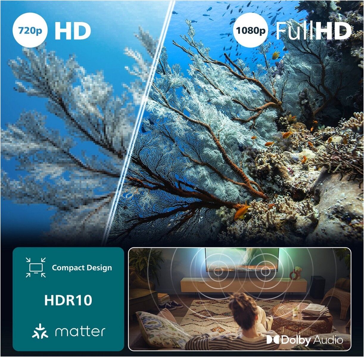 Kompakter Bildschirm. Erschwinglicher Preis. Fortschrittliche Bild- und Tonqualität. Mit Ambilight, das über den Bildschirm hinausgeht und allen Smart TV-Inhalten, die Sie gerne in Full HD ansehen. Genießen Sie ein noch intensiveres Fernseherlebnis zu Hause oder unterwegs.
