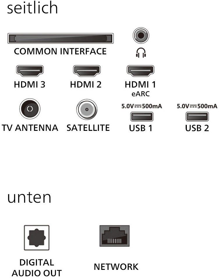 DVB-T2/-C/-S2 Triple Tuner, 3x HDMI (eARC auf HDMI 1), HDMI 2.1, 2x USB, CI+, Digitaler Audio-Ausgang (optisch), LAN, WLAN 802.11ac (2x2 Dualband) & Bluetooth 5.2 integriert