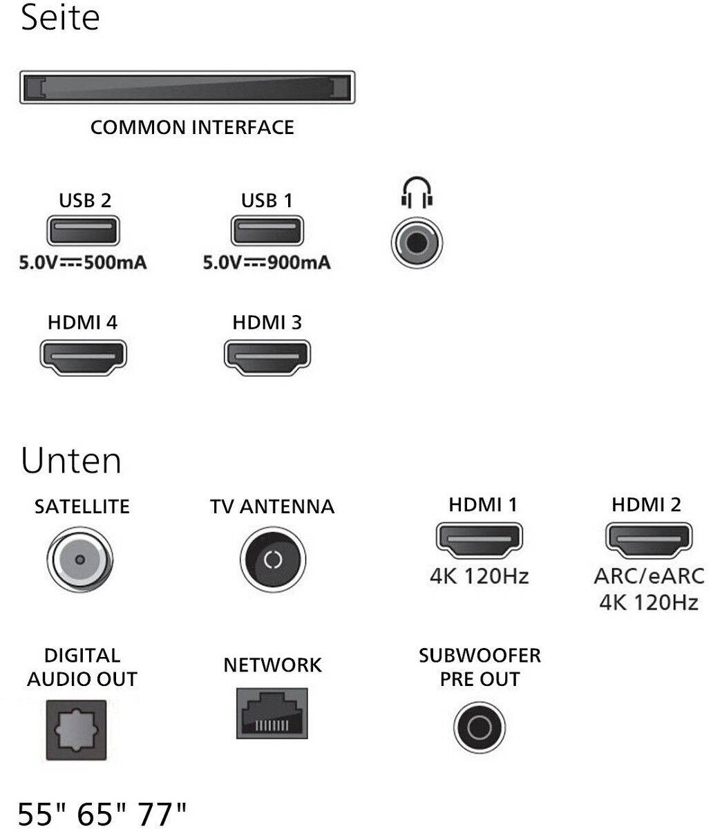 DVB-T2/-C/-S2 Triple Tuner, 4x HDMI (eARC auf HDMI 2), HDMI 2.1, 2x USB, CI+, Digitaler Audio-Ausgang (optisch), LAN, WLAN 802.11ax (2x2 Dualband) & Bluetooth 5.2 integriert