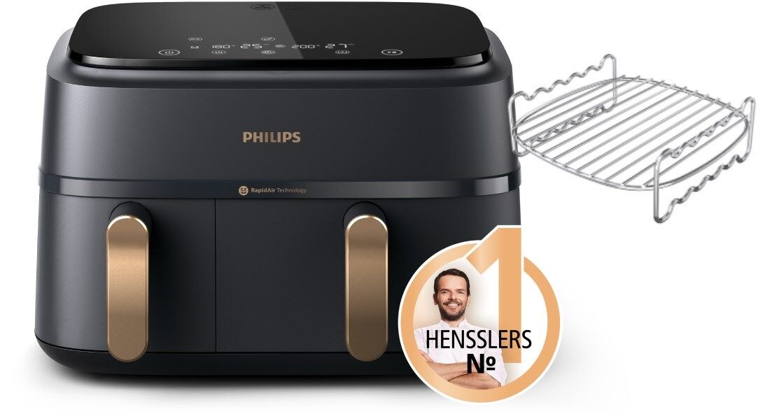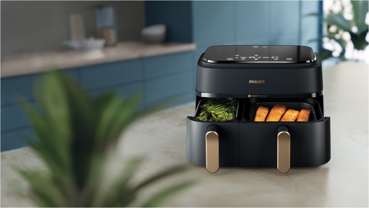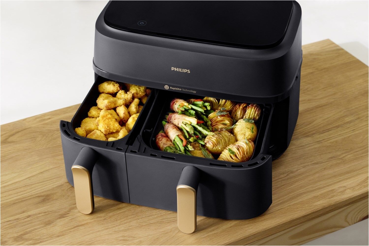 Mit dem Philips Airfryer 3000 Series Dual Basket bereitest du mühelos zwei köstliche Gerichte gleichzeitig zu.