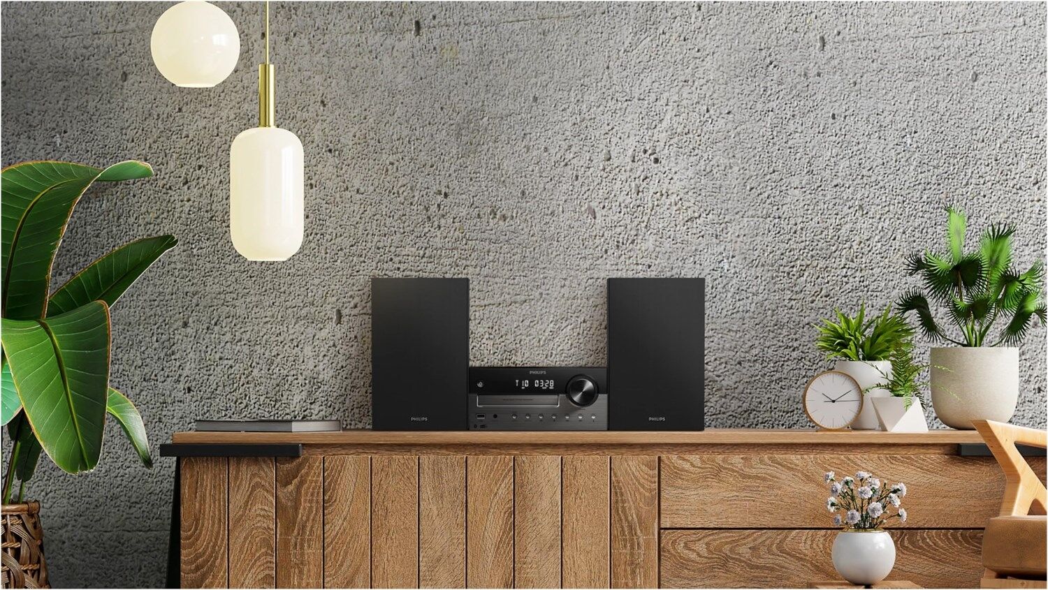 DAB+-/UKW-Radio, CDs, Streaming und mehr! Dieses kompakte Mikrosystem mit Regallautsprechern erfüllt größere Räume mit sattem 80-W-Sound. Dank der Unterstützung für Auracast™ können Sie Ihre Musik über kompatible Lautsprecher im ganzen Haus übertragen.