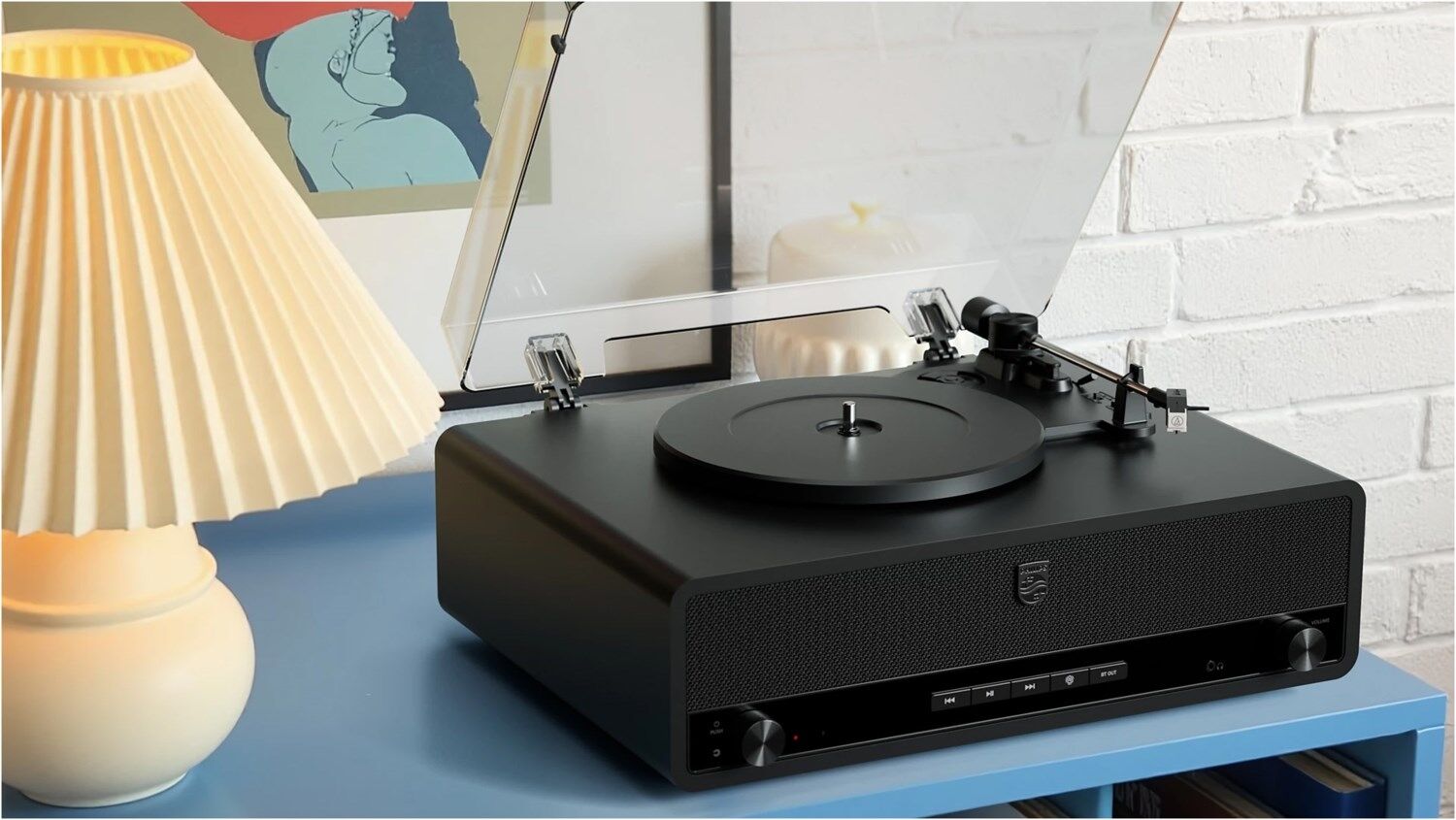 Das All-in-One-Design passt perfekt auf Schreibtische und Sideboards – außerdem ist es mit Bluetooth® und unserer praktischen Begleit- App für Ihr Vinyl ausgestattet.