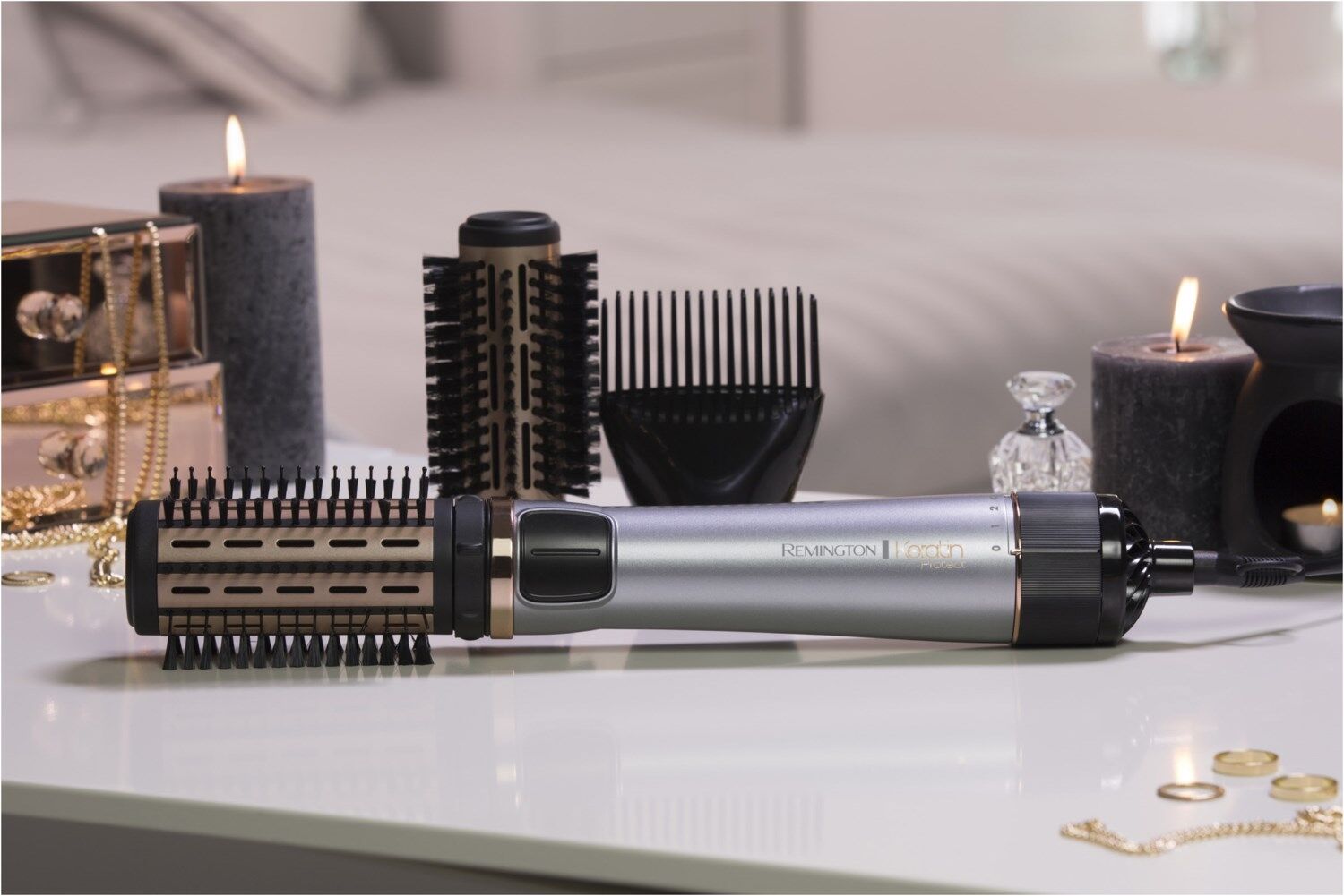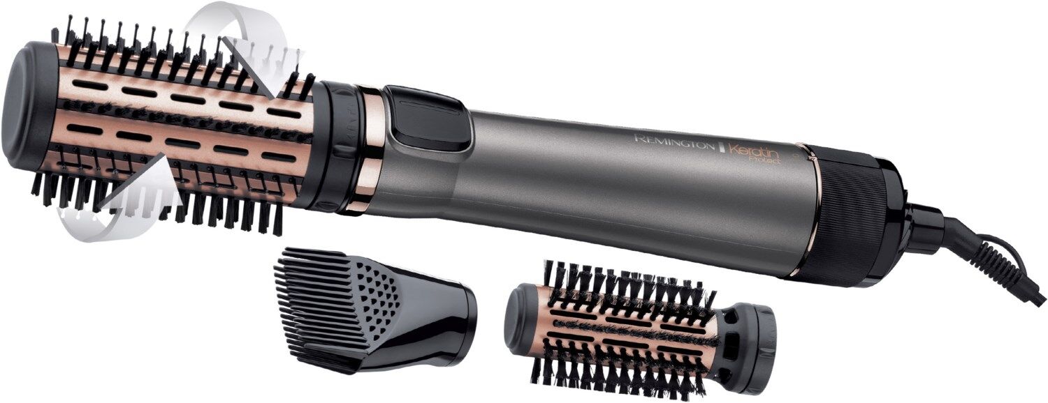 Mit der 1000 Watt starken Keratin Protect rotierende Warmluftbürste AS8810 ist dabei das Trocknen und Stylen der Haare möglich. Diese rotiert im Rechts- oder Linkslauf und verfügt über 2 kombinierte Heiz- und Gebläsestufen. Die 2 Rundbürstenaufsätze mit Thermo- und Thermo-Mischborsten ermöglichen ein individuelles Styling und können durch das Betätigen des Auslöseknopfes ganz einfach ausgetauscht werden.