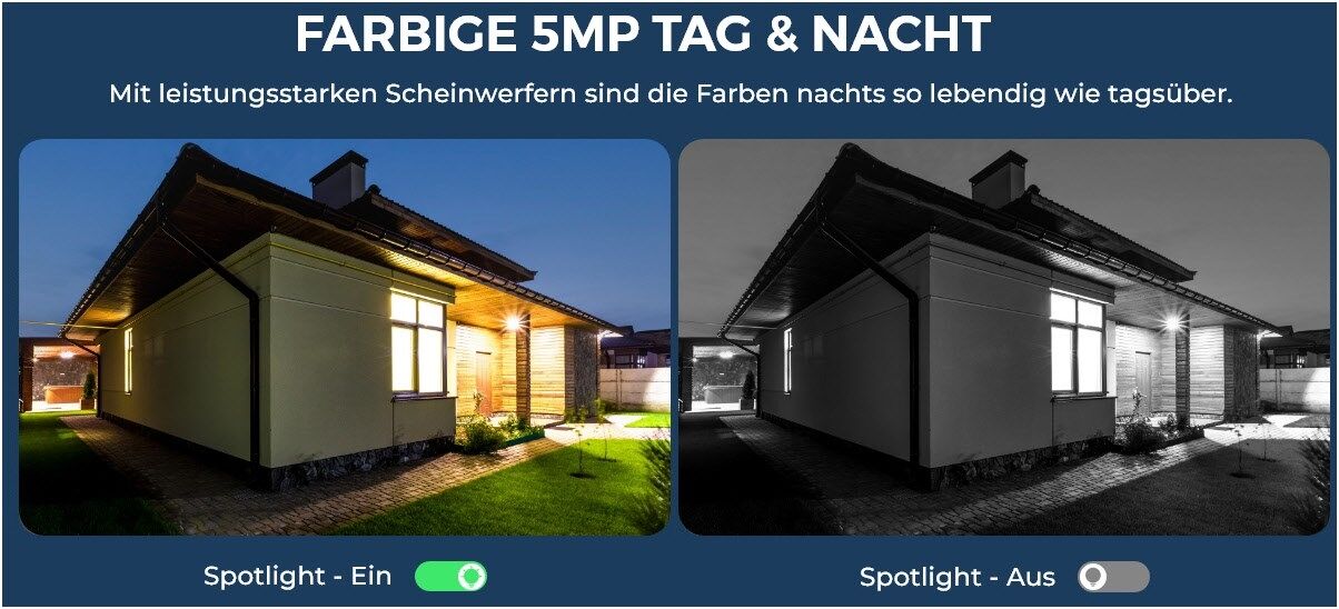 Ausgestattet mit 2x 6500 K Spotlights können Sie bis zu 10 m weit in Farbe sehen. Kein Verbrechen kann versteckt werden, auch nicht bei Nacht.