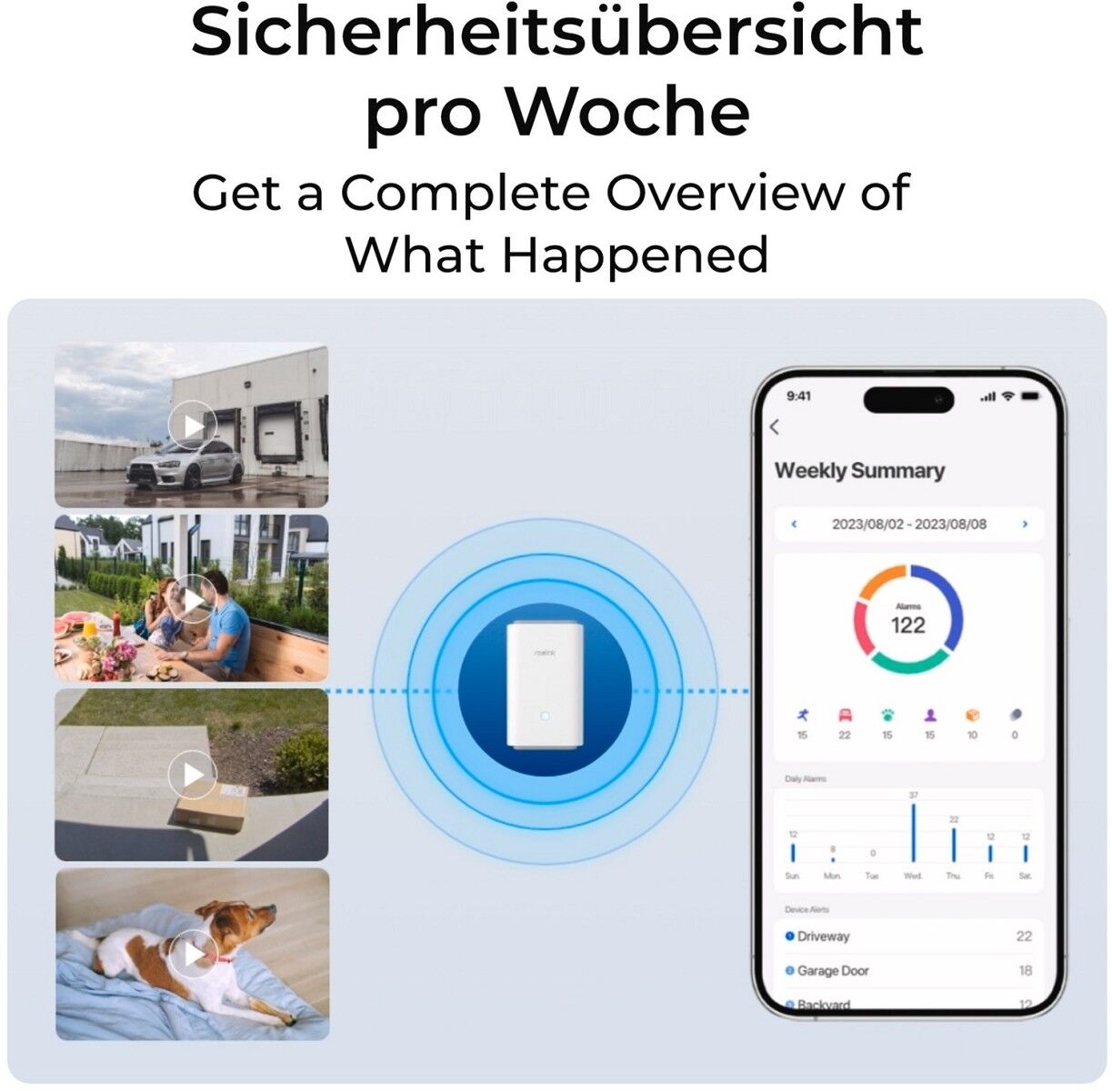 Der Home Hub Pro lässt sich nahtlos mit smarten Kameras integrieren, die eine kostenlose Erkennung von Personen, Fahrzeugen und Tieren bieten und löst einen Sirenenalarm aus, sobald eine Bewegung erkannt wird.