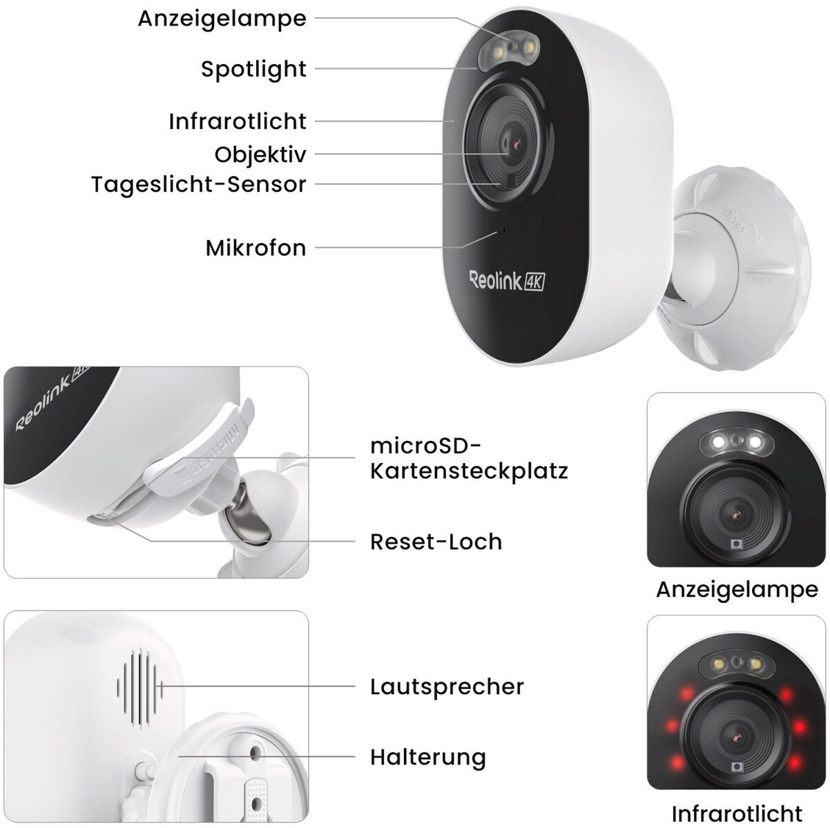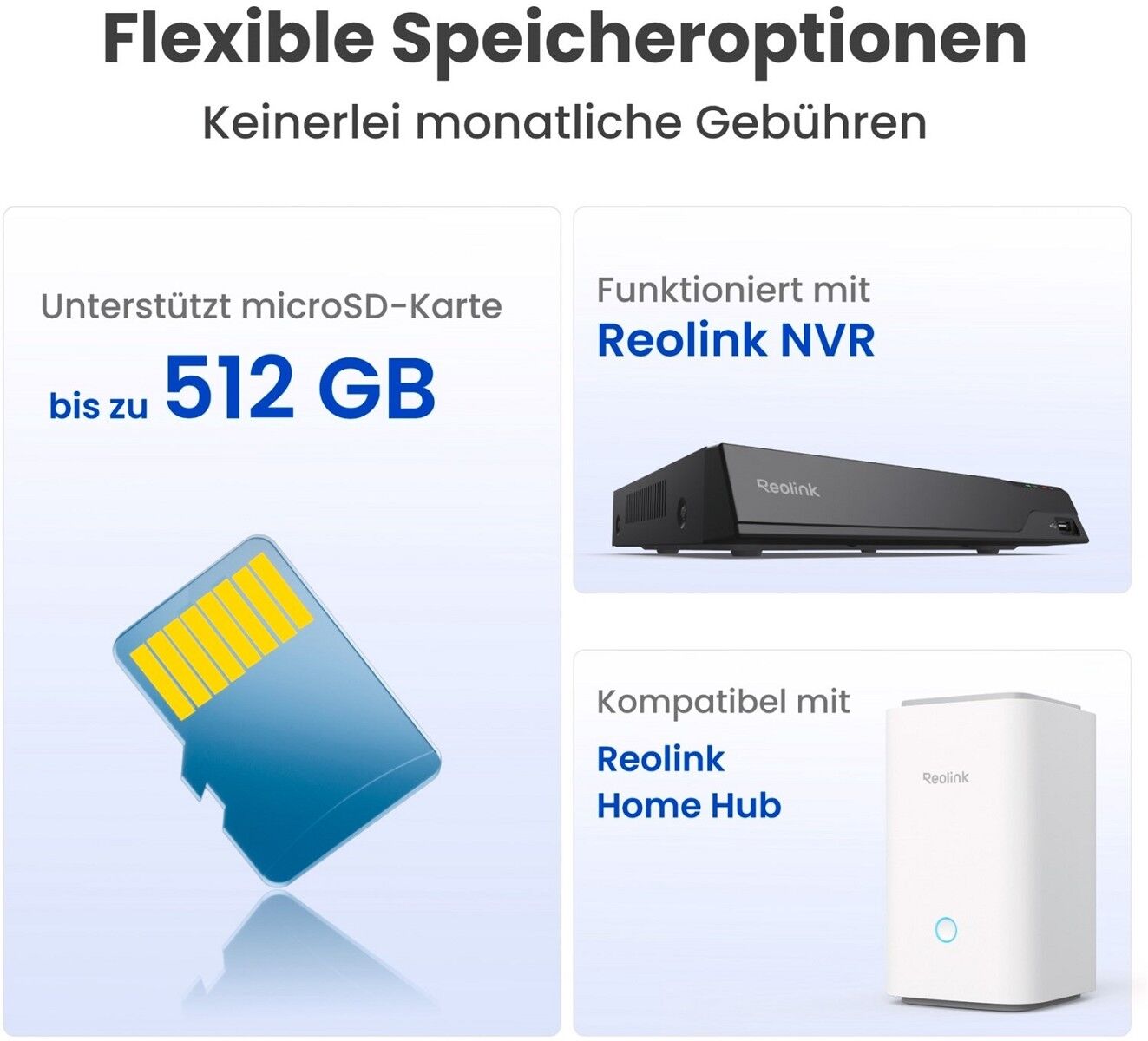 Mehrfache Speicheroptionen - Filmmaterial ganz einfach vor Ort speichern. Sie können sich für eine microSD-Karte mit bis zu 512 GB entscheiden oder die Kamera mit einem Reolink NVR oder Hub für einen größeren Speicherplatz integrieren