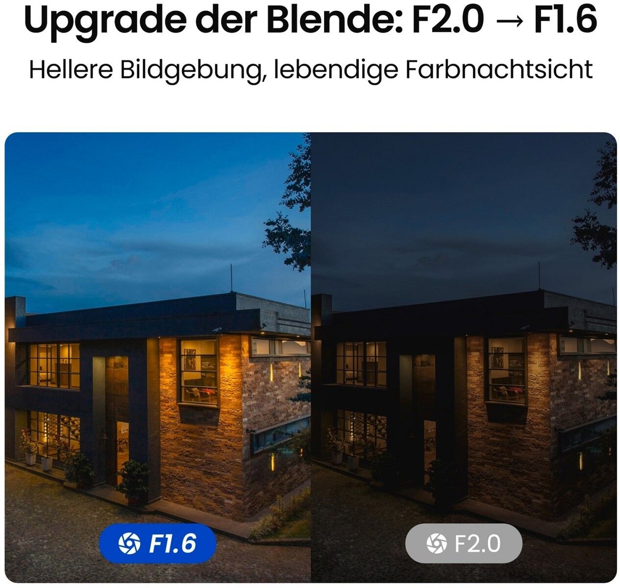 Atemberaubende Nachtsicht in 4K-Klarheit - Alle Details in brillanten Farben erfassen, auch bei geringem Licht. Mit der größeren Blende F1.6 erhält die 4K-Kamera mehr Licht für eine hochwertige Nachtsicht