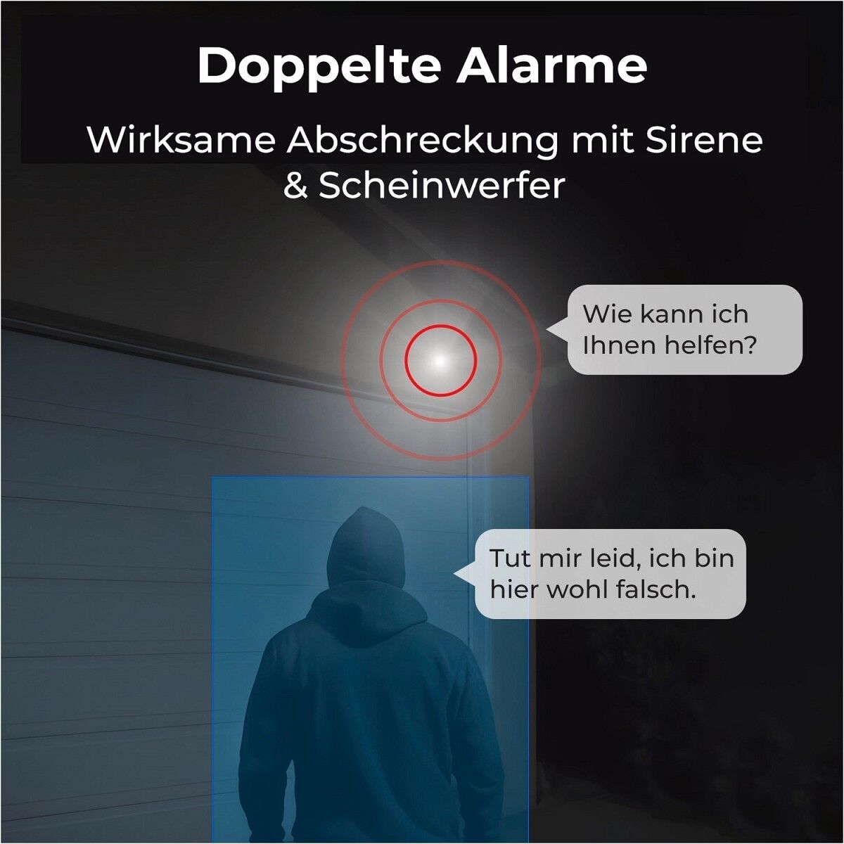 Zweifache Abschreckung durch Licht & Ton - Bei Bewegungserkennung aktiviert die Kamera Spotlight- & Sirenenalarm gegen mögliche Gefahren. Zusätzlich kann das Zwei-Wege-Audio Eindringlinge abschrecken