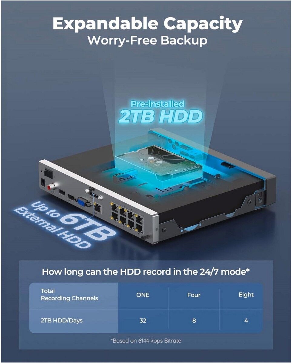 Erweiterbar auf bis zu 8 Kanäle mit verschiedenen Reolink-Geräten, passend zu Ihren persönlichen Anforderungen. Erweiterbar auf Max. 12 TB Speicher. (6 TB/Sata & eSata-Anschluss). Zuverlässiger lokaler Speicher.