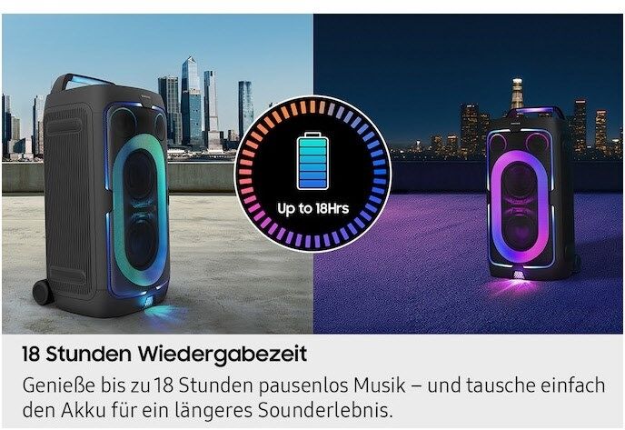 Feiere bis zu 18 Stunden am Stück mit nur einer Akkuladung. Dank des ausdauernden Akkus liefert der Sound Tower überall lang anhaltenden Sound – ganz ohne Kabel. Und wenn die LED-Anzeige signalisiert, dass ein Akkuwechsel fällig ist, kannst du ihn einfach austauschen – und die Party geht weiter.