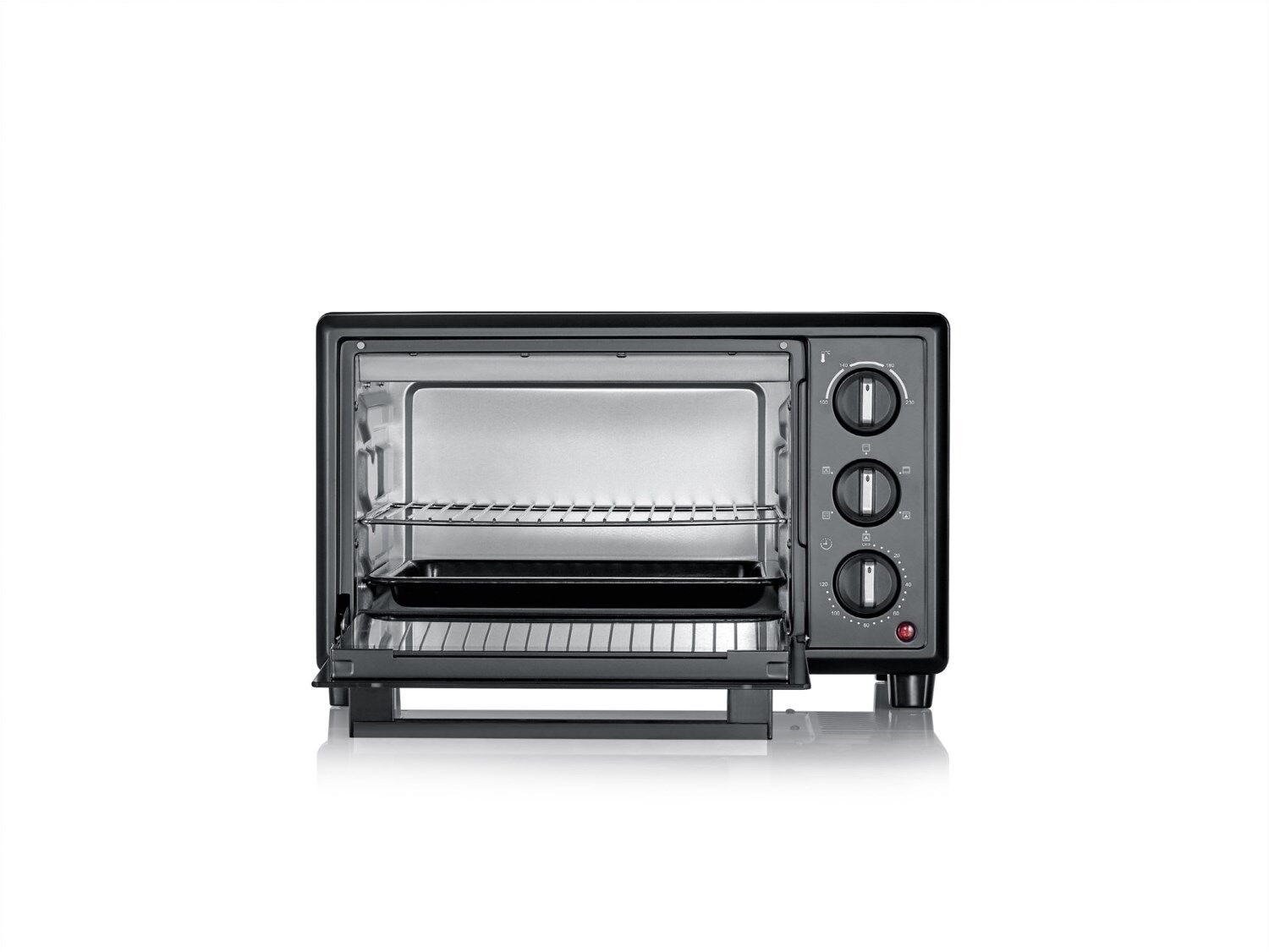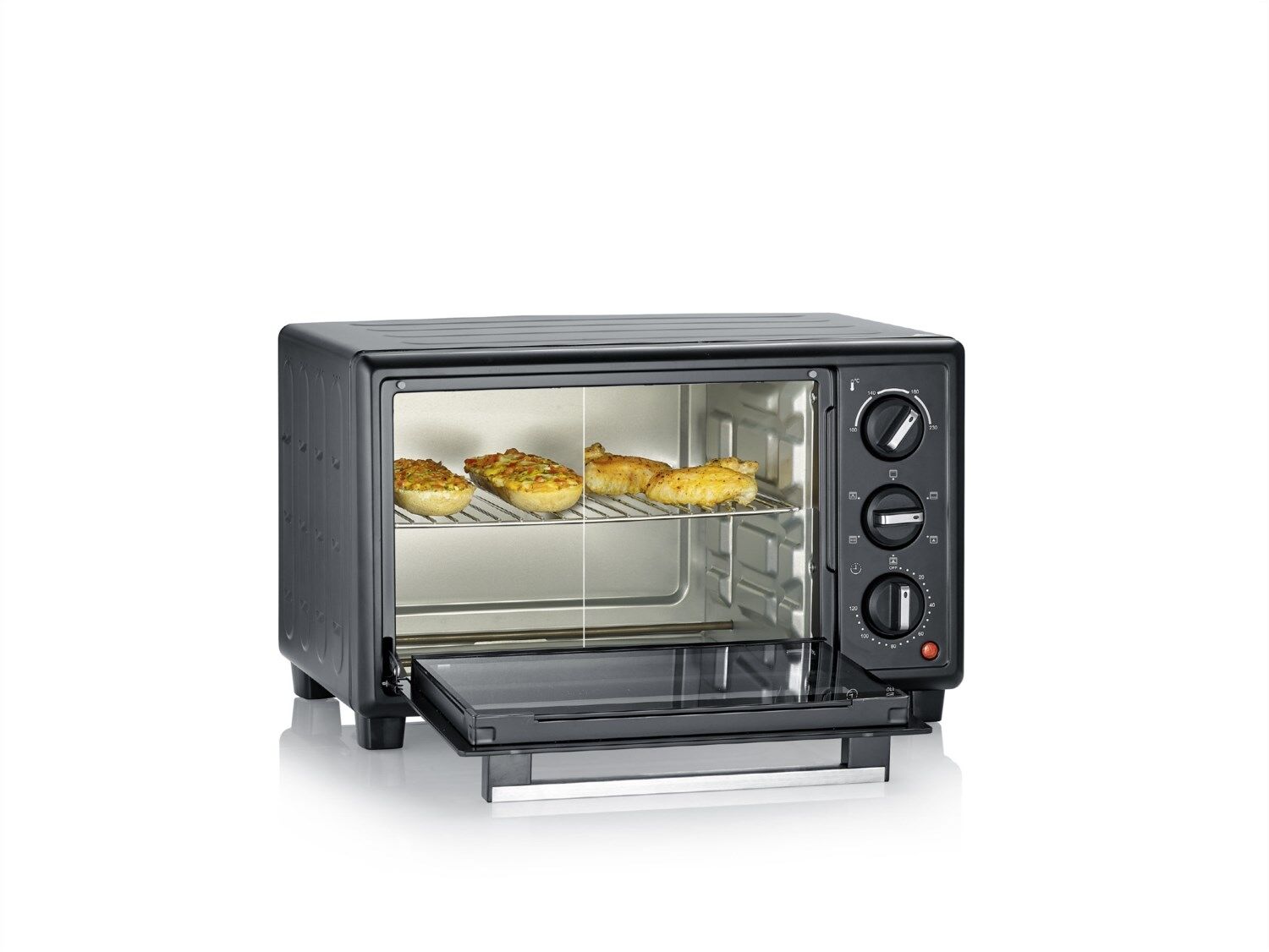 Vielseitig einsetzbar für die Zubereitung von Pizza, Pommes, Brötchen, Kuchen und Aufläufe. Inklusive umfangreichem Zubehör: Pizzastein, Backblech, Drehspieß, Krümelblech und Entnahmegriff