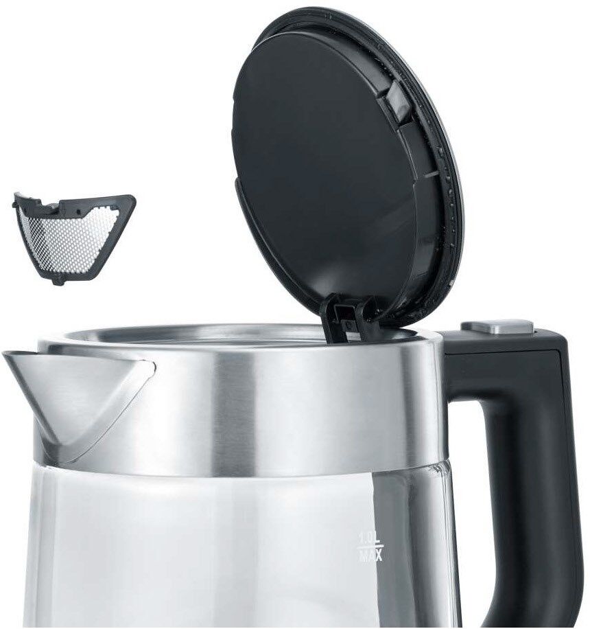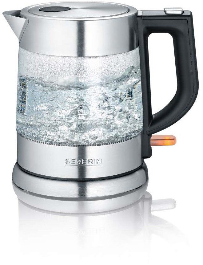 Severin WK 3468. Fassungsvermögen Wassertank: 1 l. Leistung: 2200 W. Produktfarbe: Schwarz, Edelstahl, Transparent, Gehäusematerial: Glas, Wasserstandsanzeige, Überhitzungsschutz. Drahtlos. Filterung