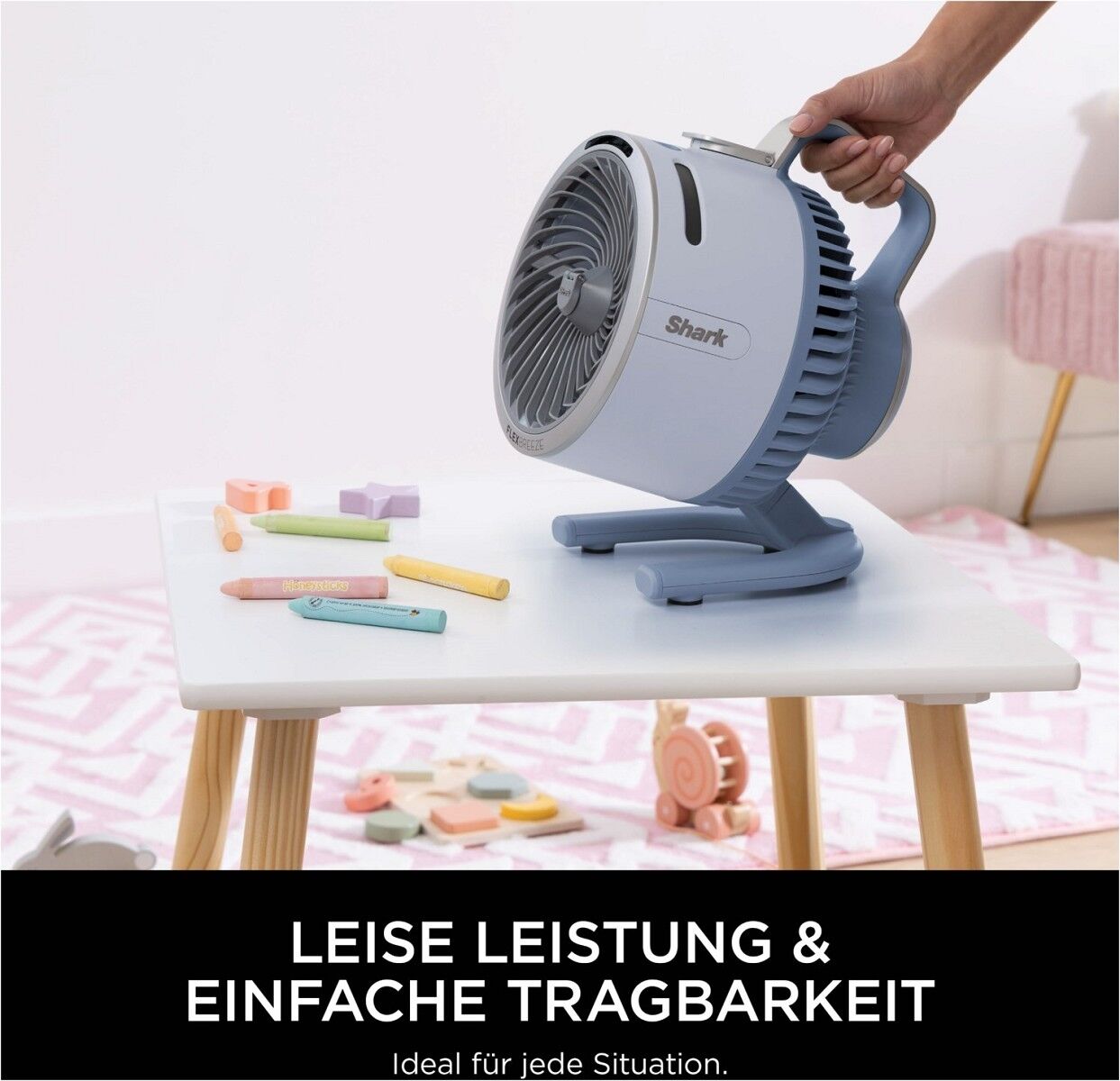 Wir präsentieren den Shark Flex Breeze HydroGo – den kraftvollen, tragbaren Ventilator, der sowohl drinnen als auch draußen mit Sprühnebel kühlt. Egal, ob du dich zu Hause abkühlst, ein Picknick im Park genießt, unter den Sternen campst oder beim Schulsportfest bist – der Shark Flex Breeze HydroGo lässt dich die Brise mitnehmen und überall einen erfrischenden Nebel erzeugen. Erfrischender Sprühnebel ohne nasse Oberflächen: Die HydroGo-Technologie von Shark erzeugt ultrafeine Tröpfchen, sodass du einen erfrischenden Sprühnebel drinnen und draußen genießen kannst, ohne nasse Oberflächen zu hinterlassen. Mit dem integrierten 150-ml-Wassertank war die Kühlung noch nie so einfach. Leicht und einfach zu tragen: Kompakt und mit weniger als 2,1 kg Gewicht ist der Shark FlexBreeze HydroGo der perfekte Begleiter für schnelle Kühlung unterwegs. Mit einer kabellosen Laufzeit von bis zu 12 Stunden bei der ersten Geschwindigkeitsstufe, ohne Sprühnebel, bleibst du länger erfrischt, ohne nachladen zu müssen. Passe deine Kühlung individuell an: Wähle aus fünf Geschwindigkeitsstufen, zwei intelligenten Brisen-Modi, kontinuierlichem Sprühnebel oder Intervall-Sprühnebel. Bei maximaler Geschwindigkeitsstufe kann der Luftstrom bis zu 20 m erreichen. Mit einer vertikalen Neigung von 45° sind deine Kühlbedürfnisse bestens abgedeckt. Zusätzlich kannst du aus einer Reihe von Zubehörteilen (separat erhältlich) wählen – darunter eine Powerbank, ein Autoladegerät, ein Standfuß und eine Tragetasche – und dein Set für jede Gelegenheit anpassen. Farblich cool Der Shark FlexBreeze HydroGo ist in einer Auswahl eleganter, moderner Farben erhältlich, die jedes Umfeld ergänzen, damit du stilvoll cool bleibst. Robust draußen, leise drinnen: Mit einer Regenbeständigkeit nach IPX5 und UV-Beständigkeit* ist der Shark Flex Breeze HydroGo robust genug für den Einsatz im Freien. Drinnen sorgt der leise Betrieb für minimale Störungen – perfekt zum Schlafen oder Arbeiten von zu Hause. Im Lieferumfang enthalten: Shark Ventilator, Ladekabel * Materialien sind UV-beständig nach UL746C.B42