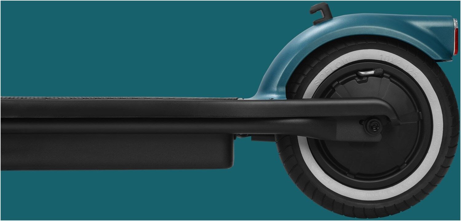 Fahren in Komfort, Stil und Sicherheit: Die 10 Zoll Reflective Tires mit einem 10 Millimeter Reflektor-Streifen direkt auf dem Luftreifen sorgen für ein reibungsloses, stabiles und sicheres Fahrerlebnis, selbst auf unebenen Strassen. Erlebe maximalen Komfort und minimale Erschütterungen während deiner Fahrt. Darüber hinaus verleiht das elegante Design des E-Scooters einen Hauch von Stil und Raffinesse.