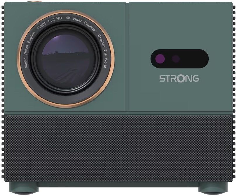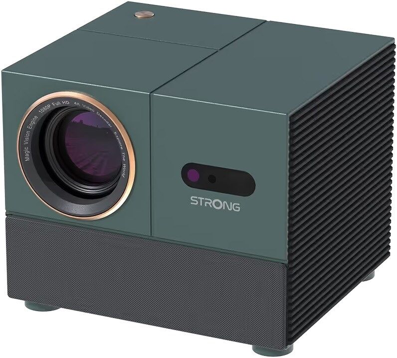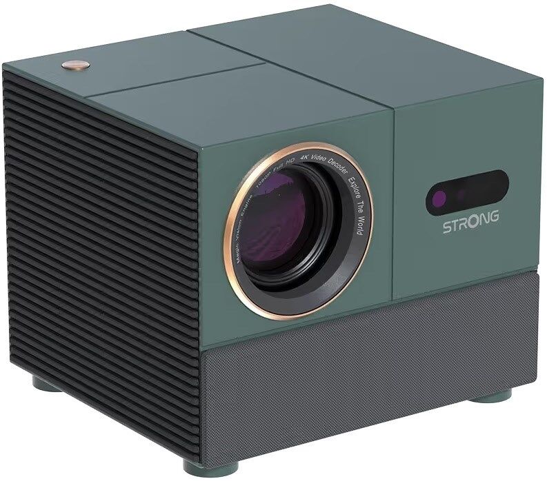 Entdecken Sie den Projektor MIRA1 Full HD von STRONG mit seinem eleganten, tannengrünen Design und Google TV für den sofortigen Zugriff auf Ihre Lieblings-Streaming-Plattformen.