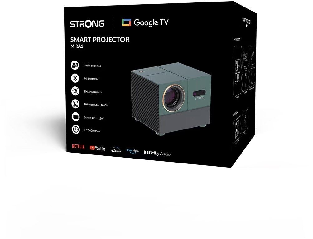 Der MIRA 1 von STRONG ist ein schlanker und vielseitiger Videoprojektor, der mit seiner eleganten tannengrünen Oberfläche jeden Raum aufwertet. Der MIRA 1 wird von der Software Google TV unterstützt, die einen nahtlosen Zugang zu all Ihren bevorzugten Streaming-Plattformen ermöglicht - direkt nach dem Auspacken. Mit einer beeindruckenden Helligkeit von 300 ANSI Lumen projiziert er eine Bildschirmgröße von 40" bis 150" Zoll und bietet scharfe Bilder und lebendige Farben. Der MIRA 1 ist ideal für Filme oder Präsentationen und vereint Funktionalität und Stil, was ihn zur perfekten Ergänzung für jeden modernen Raum macht.