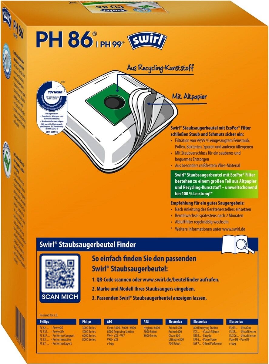 Swirl PH 86. Produktfarbe: Orange, Weiß, Kompatibilität: Philips, AEG, Electrolux, Volta. Verpackungsart: Box. Anzahl Staubbeutel: 4 Stück(e), Anzahl Filter: 1 Stück(e)