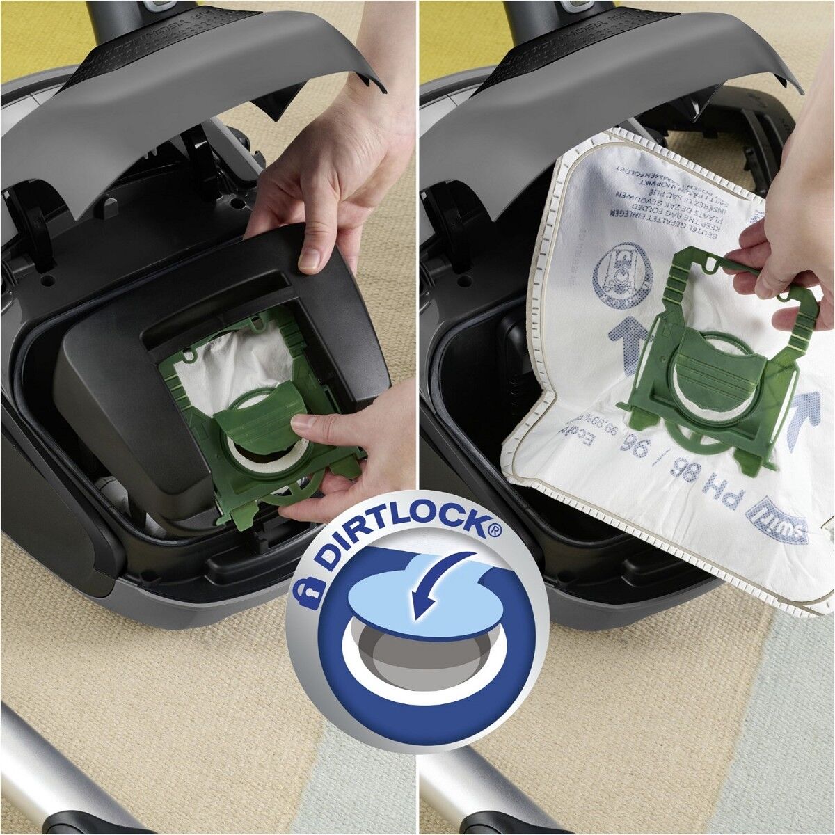 Der Volumenstaubspeicher und die abgerundeten Ecken stellen eine optimale Ausnutzung des Staubraums sicher und ermöglichen somit eine längere Verwendungsdauer des Beutels. Sollte der Beutel doch einmal voll sein, ist die Entsorgung dank des praktischem Dirtlock® Staubverschlusses bequem und sauber.