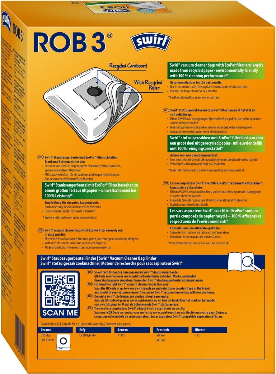 Swirl® ROB 3® EcoPor® Staubsaugerbeutel passend für Saugroboter der Marken Dreame, Lenovo, Proscenic, Eufy und Ultenic.