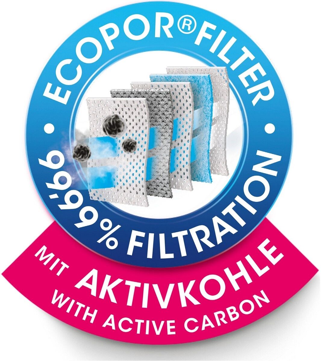 Der EcoPor® Filter filtert 99,99% des eingesaugten Hausstaubs und allergenen Feinstaubs, wie z.B. Pollen, Schimmelsporen, Milbenkot und Bakterien.