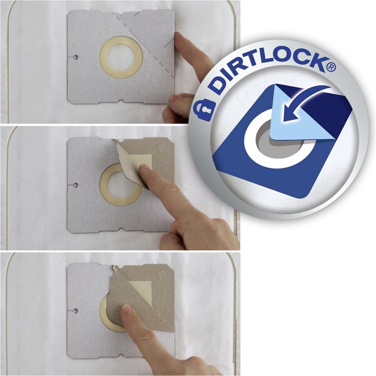 Der Volumenstaubspeicher und die abgerundeten Ecken stellen eine optimale Ausnutzung des Staubraums sicher und ermöglichen somit eine längere Verwendungsdauer des Beutels. Sollte der Beutel doch einmal voll sein, ist die Entsorgung dank des praktischem Dirtlock® Staubverschlusses bequem und sauber.