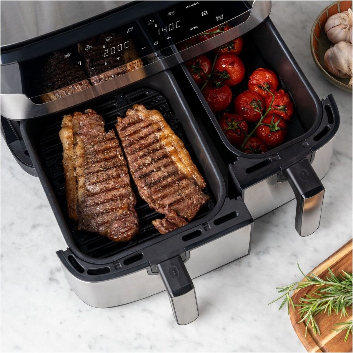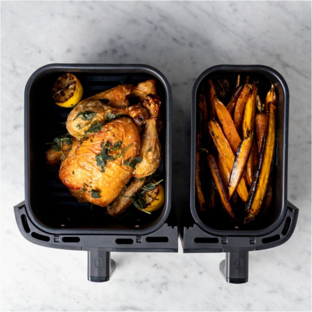 Zwei Schubladen: eine große für Hauptgerichte und eine kleine für Beilagen, um gleichzeitig eine vollständige Mahlzeit zuzubereiten