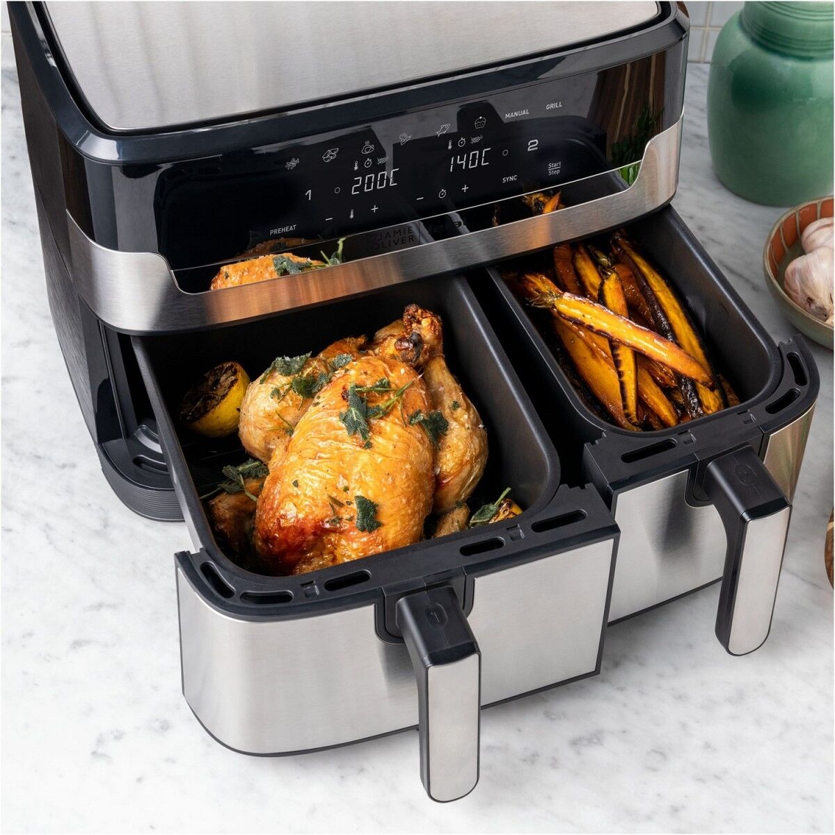 Dual Easy Fry ist 40 % schneller und bis zu 70 % energieeffizienter als ein herkömmlicher Backofen und wird mit einer kostenlosen Rezept-App geliefert, die eine Vielzahl an Rezepten und täglichen Inspirationen bietet, von herzhaften Gerichten, die in nur 15 Minuten zubereitet sind, bis hin zu besonders gesunden Ideen, die auf der Heißluftfritteusen-Technologie des Geräts beruhen - und das alles auf Knopfdruck!