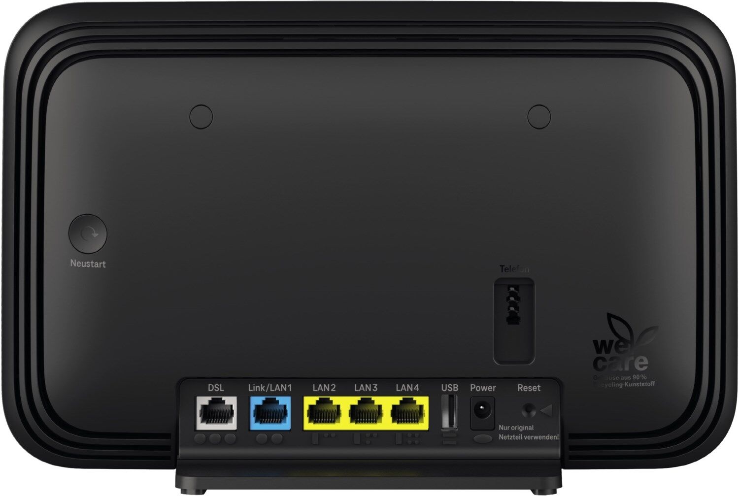 3x Gigabit LAN, 1x Gigabit LAN / WAN z.B. zur Nutzung am Gf-Modem, 1x USB 2.0 (für z.B. Drucker, Festplatte oder künftige Erweiterungen), 1x TAE für analoges Telefon