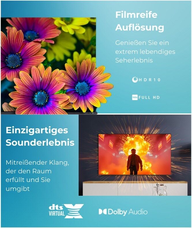 Erleben Sie eine Audioqualität, die Sie normalerweise nur im Kino finden. Genießen Sie dank Dolby Audio™ authentisch klingende Dialoge und hören Sie mehr von dem, was auf dem Bildschirm passiert.