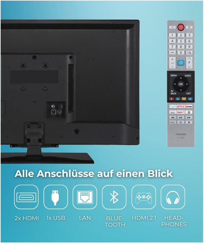 DVB-T2/-C/-S2 Triple Tuner, 2x HDMI, 1x USB, CI+, Digitaler Audio-Ausgang (koaxial), LAN, WLAN & Bluetooth integriert