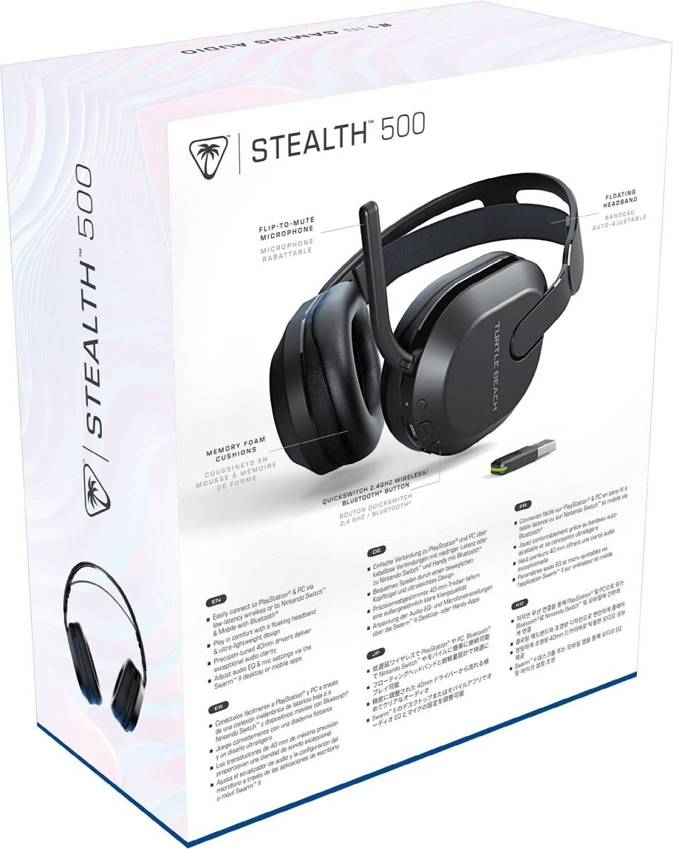 Das Turtle Beach® Stealth™ 500 für Windows PCs, PS5™ und PS4™, Nintendo Switch™ und Mobilgeräte definiert, was ein kabelloses Gaming-Headset der "Einstiegsklasse" leisten kann. Wechsle ganz einfach zwischen kabellosen 2.4 GHz- und Bluetooth®-Verbindungen mit der QuickSwitch-Taste. Eine Akkulaufzeit von bis zu 40 Stunden und ein ultraleichtes, bewegliches Kopfband mit Memory-Foam-Ohrpolstern sorgen dafür, dass du stundenlang in vollem Komfort am Spiel teilnehmen kannst. Präzise abgestimmte, verstärkte 40-mm-Treiber und die umfangreiche Audioeinstellung in Swarm™ II-Desktop und Handy-Apps sorgen für eine ultraklare, anpassbare Audioqualität, die für räumliches Audio optimiert ist. Chatte dank des omnidirektionalen "Flip-to-mute"-Mikrofons mit ultraklarer Sprachgenauigkeit.