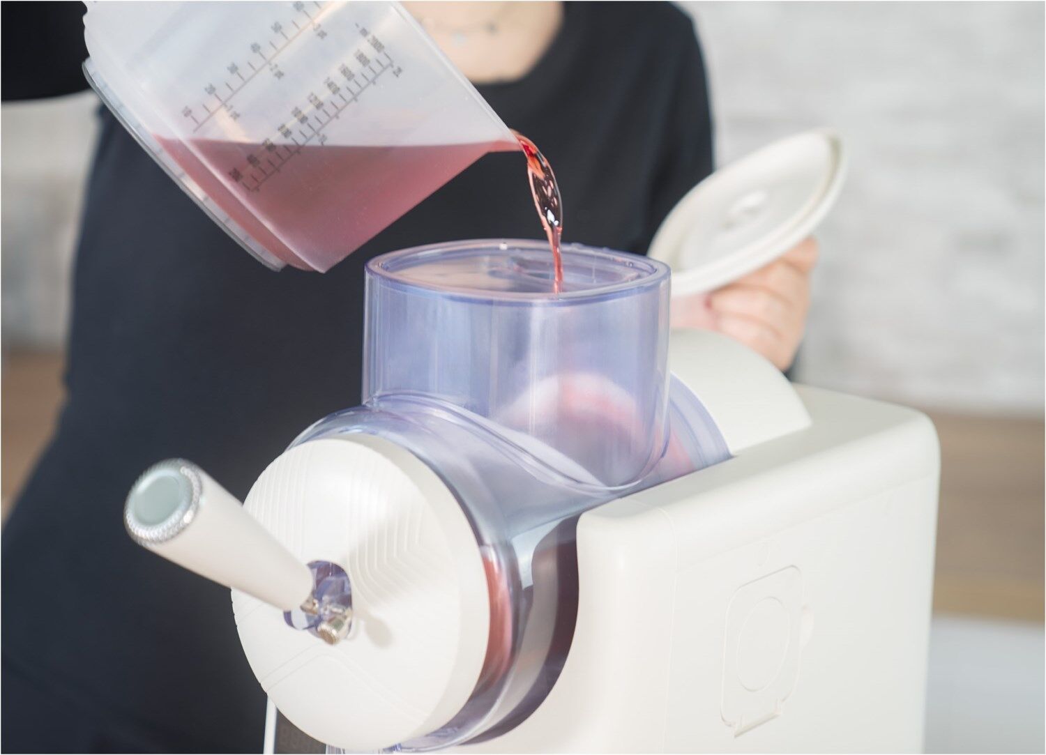 Großer Behälter mit ca. 2 Litern Fassungsvermögen (maximale Füllmenge 1,5 Liter) für mindestens 6 Portionen pro Durchgang