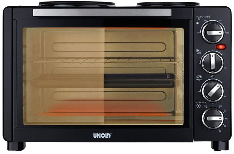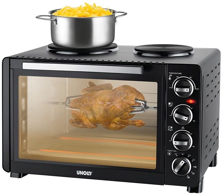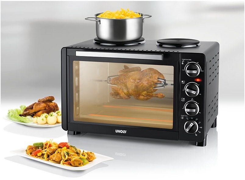 Unold 68885. Produkttyp: Freistehender Kocher, Produktfarbe: Schwarz, Steuerung: Drehregler. Kochfeldtyp: Keramik, Anzahl Herdplatten/Kochzonen: 2 Zone(n), Anzahl der elektrischen Herdplatten: 2 Zone(n). Ofengröße: Klein, Stromquelle Ofen: Elektro, Netto-Ofenvolumen: 30 l. AC Eingangsspannung: 220 - 240 V, AC Eingangsfrequenz: 50/60 Hz. Breite: 365 mm, Tiefe: 510 mm, Höhe: 346 mm