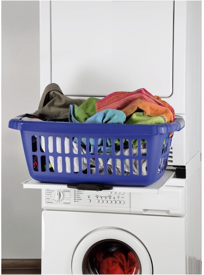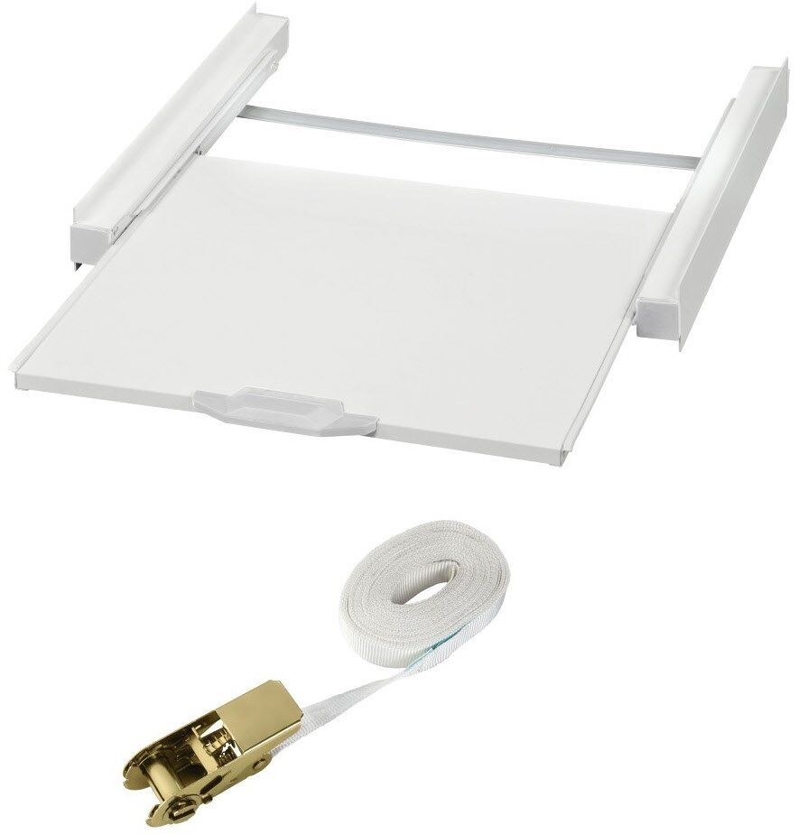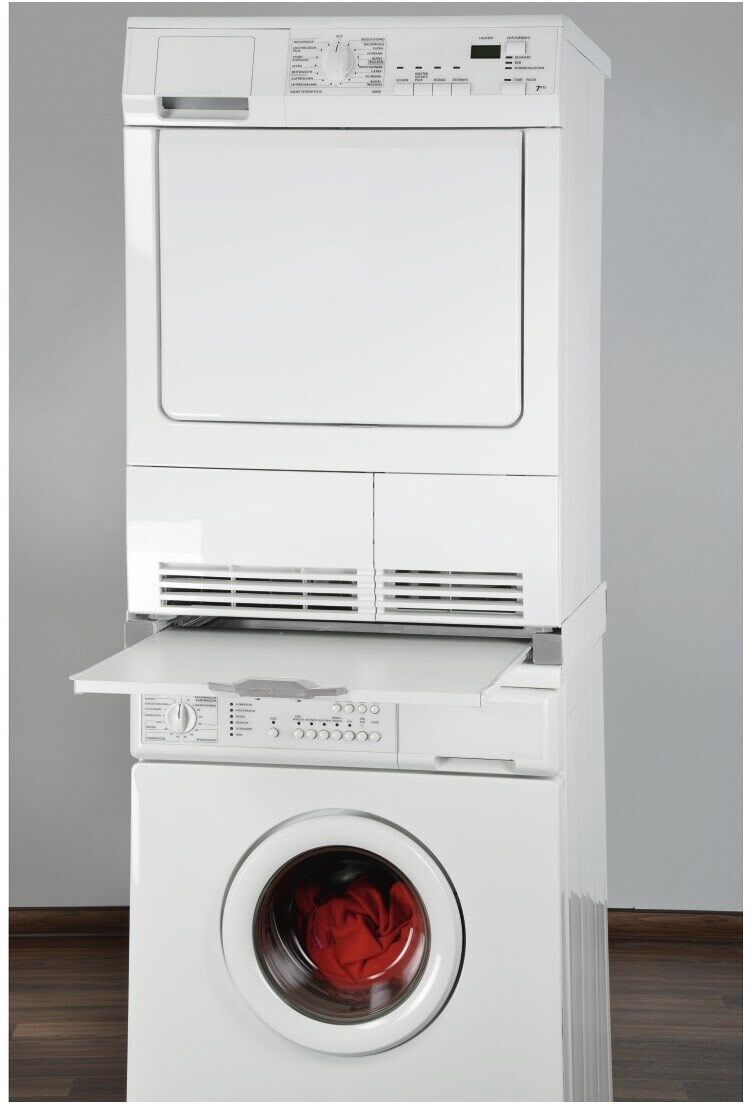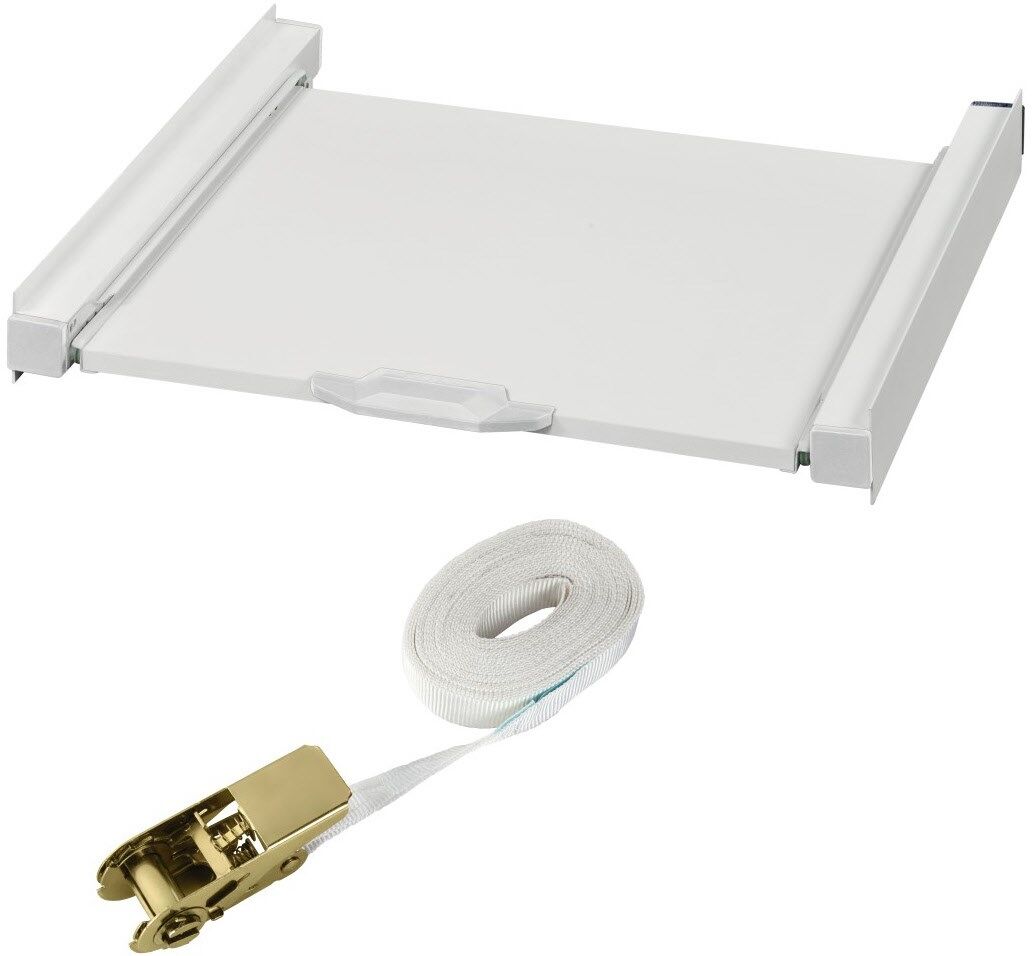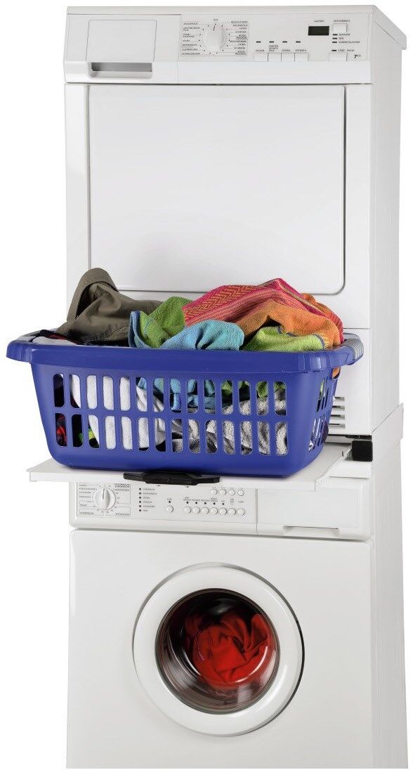universeller Zwischenbaurahmen zum sicheren Befestigen des Trockners auf der Waschmaschine: Die Seitenschienen verhindern das Wandern des Trockners bei Vibrationen der Waschmaschine