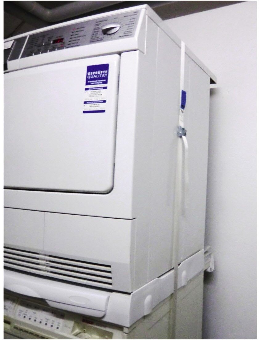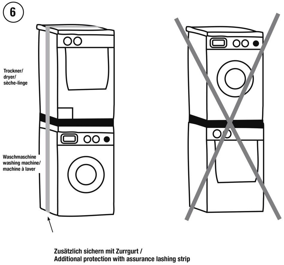 mit Auszugssperre und Sicherheits-Zurrgurt zur optimalen Sicherung - ein Herunterkippen des Trockners z.B. durch Zugbelastungen an der Tür wird verhindert.