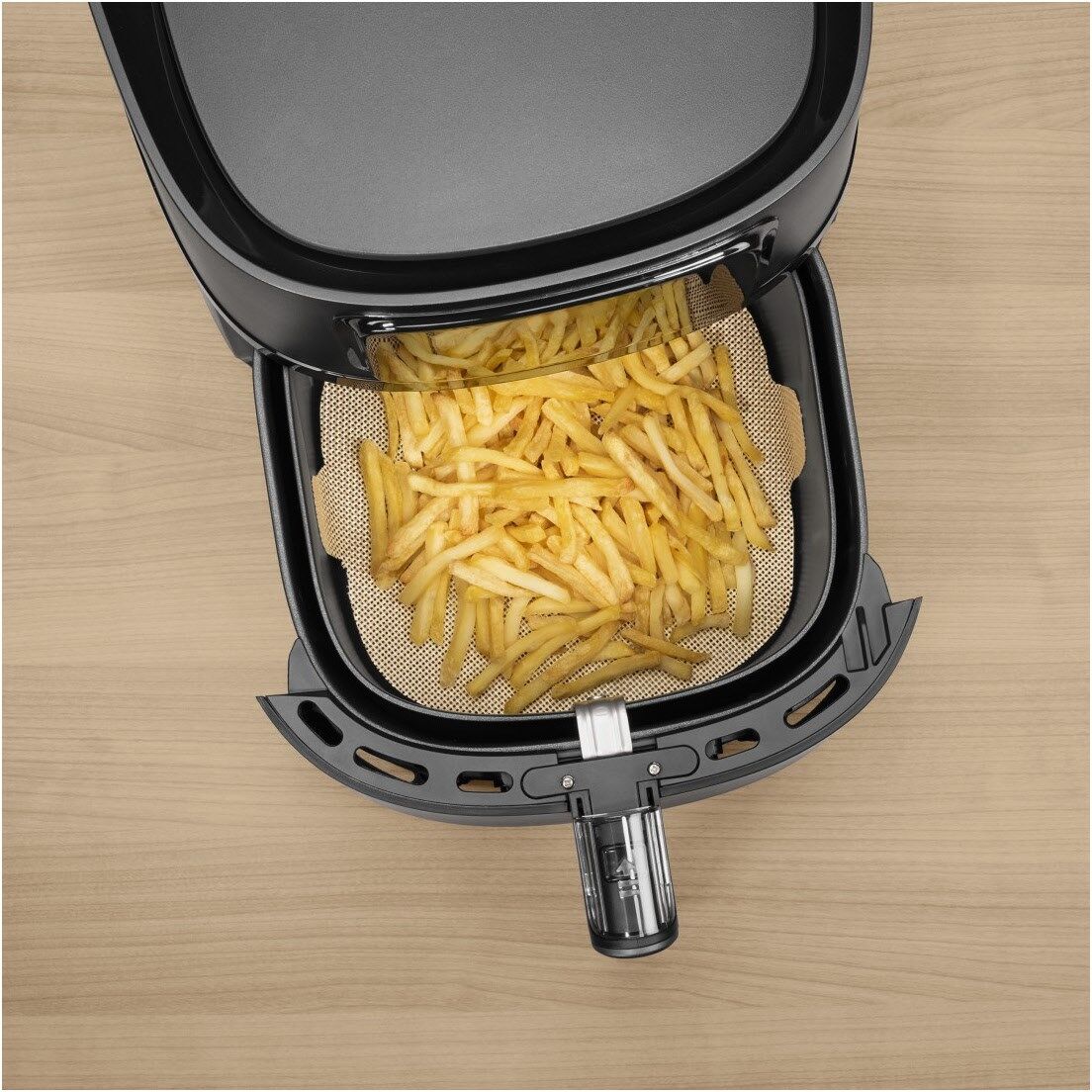 Fettauffang-Einsatz: Die Schutzeinlagen halten die Fritteuse sauber. Die geschlossene Einlage wird in den unteren/äußeren Korb gelegt und schützt vor austretenden Flüssigkeiten, 24 x 25 cm. Die perforierte Einlage wird auf den inneren Korb/auf die Platte gelegt und verhindert das Anhaften des Garguts auf dem Gitterost, 23,2 x 24,2 cm. Dampfdurchlässiges Material für ungehinderte Luftzirkulation in der Fritteuse. Hitzebeständig bis 260 °C. Zuschneidbar auf die gewünschte Größe - für alle handelsüblichen Airfryer geeignet. Seitliche Laschen, um die Einlagen nach Gebrauch bequem zu entnehmen. Einfach zu reinigen: spülmaschinengeeignet. Die Filter sind wiederverwendbar, bei richtiger Anwendung bis zu 100 Mal. BPA-frei.